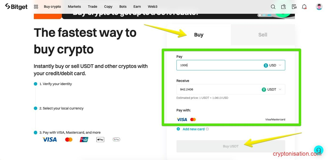 Покупка криптовалюты с карты - Активируйте вкладку Buy и заполните необходимые поля: укажите фиатную валюту для оплаты (например, USD) и USDT как криптовалюту для получения;
