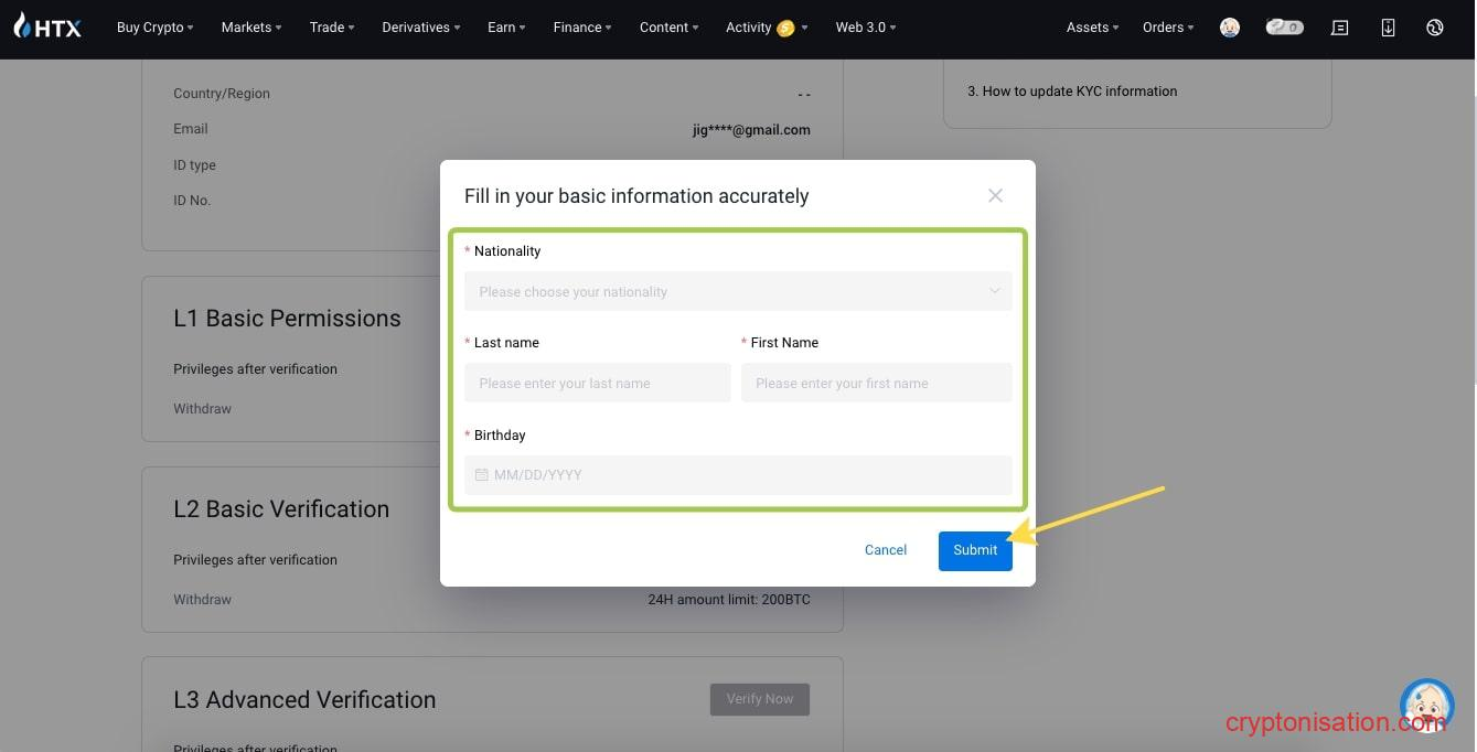 Уровни проверки - Укажите базовые личные данные: гражданство имя и фамилия, дата рождения. Нажмите Submit.