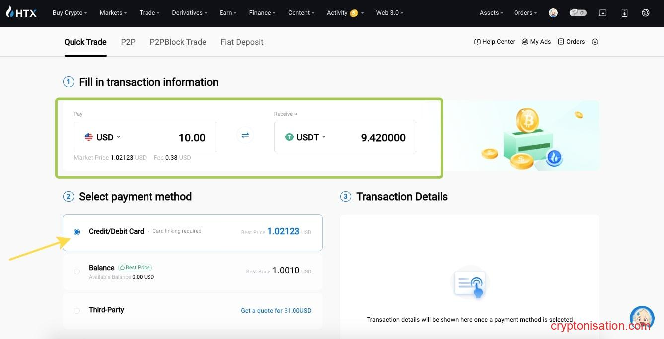 Биржа HTX (Huobi) поддерживает различные платежные методы, включая кредитные и дебетовые карты, банковские переводы, криптовалютные депозиты, а также платежные системы.
