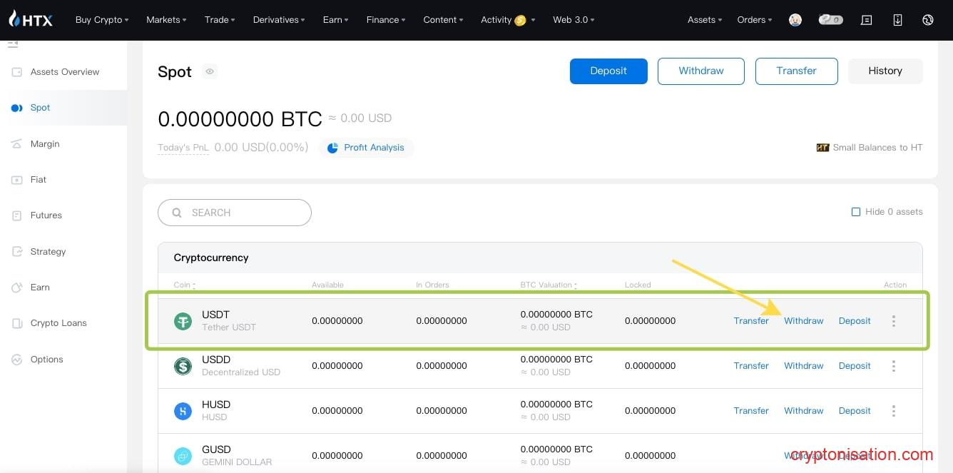 Вывод средств со спотового счета - В строке USDT выберите опцию Withdraw;