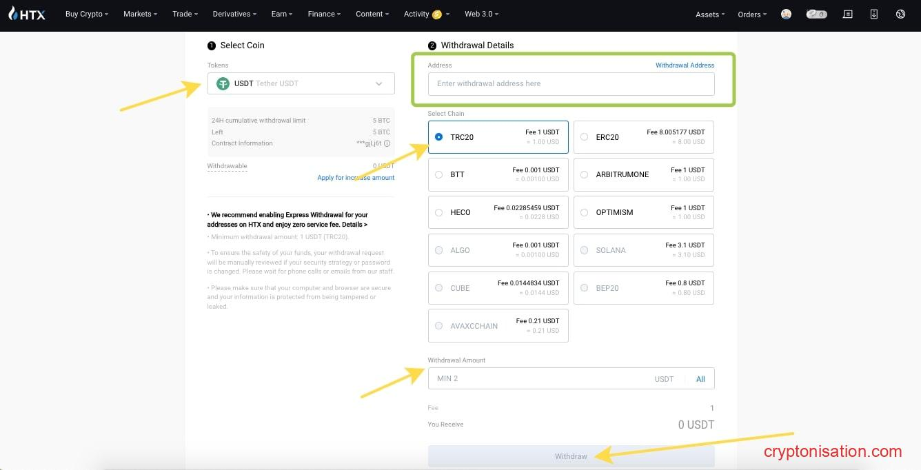 Вывод USDT - Выберите сеть для перевода (например, TRC20). Учтите, что в кошельке-получателе также следует выбрать сеть TRC20, иначе потеряете средства;