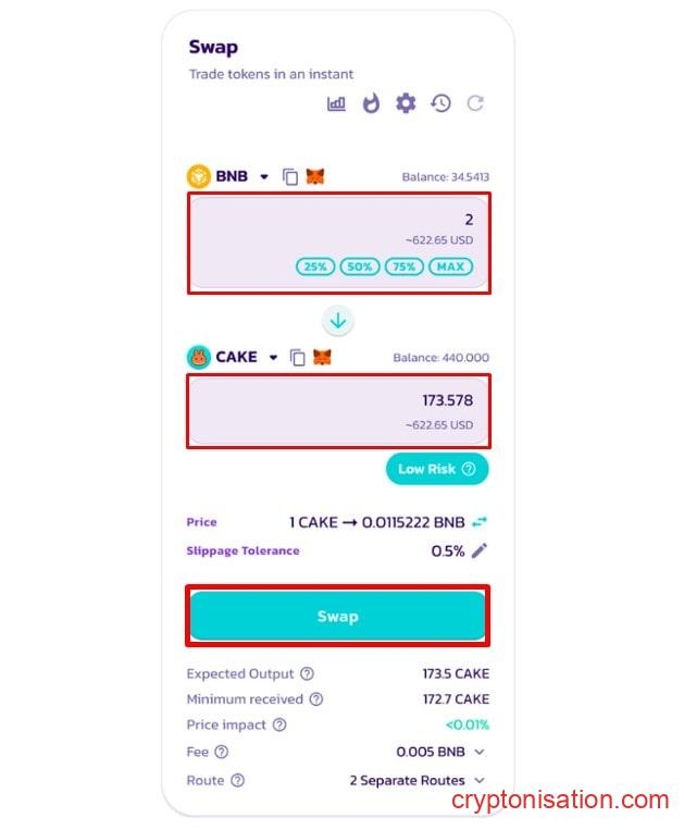 Переход в раздел Swap - В первом поле введите сумму криптовалюты, которую отдаете. Во втором — выберите монету, которую хотите купить;