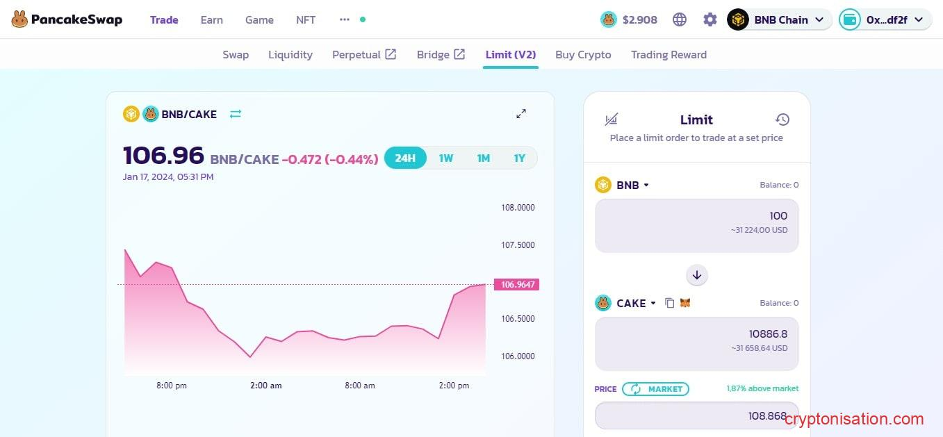 Pancakeswap предлагает спот-трейдинг с лимитными и рыночными ордерами (Swap), а также торговлю бессрочными фьючерсными контрактами. Для опытных трейдеров предлагается увеличить капитал на фьючерсах с помощью кредитного плеча до x250.