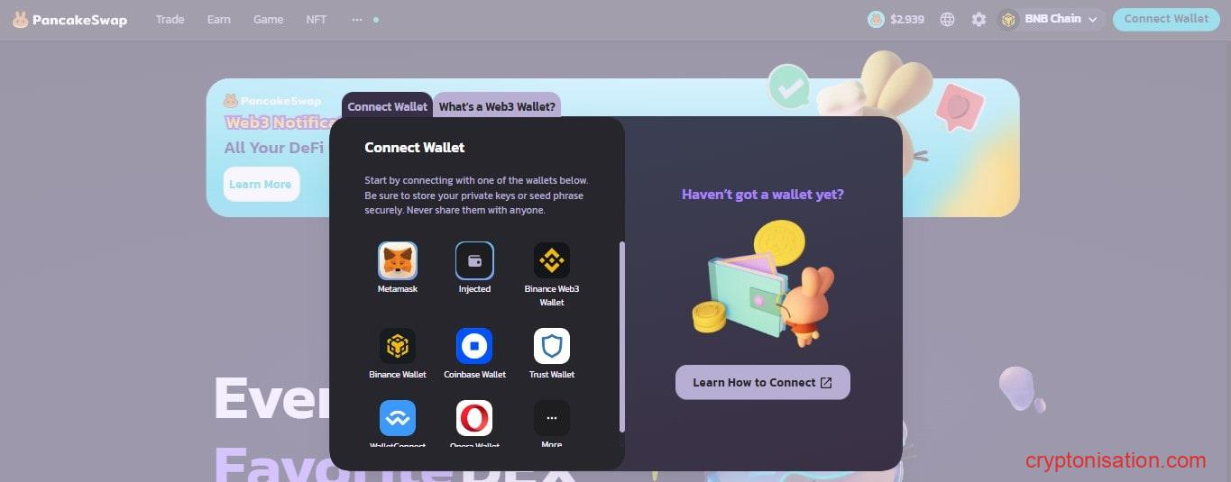 Для проведения любых операций на децентрализованной криптобирже PancakeSwap необходимо создать криптовалютный кошелек и подключить его к бирже. Мы рекомендуем использовать MetaMask или Trust Wallet. В отличие от централизованных платформ (CEX), PancakeSwap не предоставляет кошельки и не хранит средства пользователей.