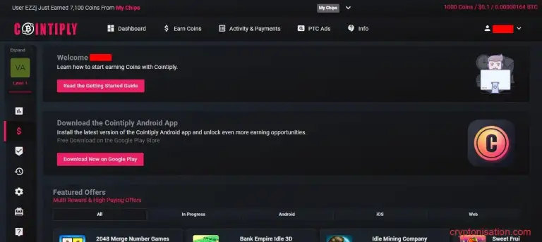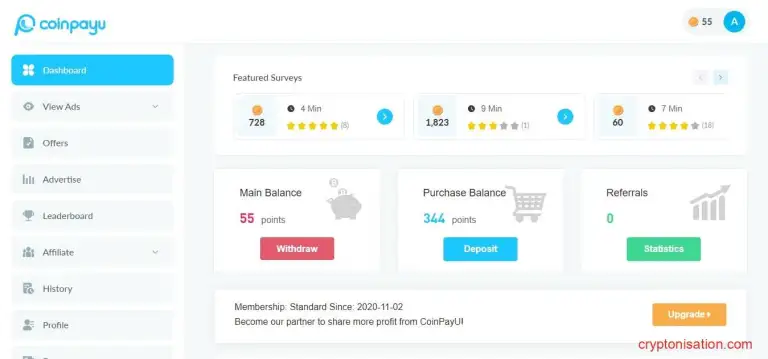 Coinpayu предоставляет множество вариантов заработка: просмотр рекламы, лотереи, конкурсы, опросы и участие в реферальной программе. Награды начисляются в коинах (1000 coin = $1), которые можно конвертировать в поддерживаемую криптовалюту. Минимальный вывод всего $1. Также доступен перевод в фиате на кошелек Payeer в USD. Заработанные средства на этой площадке можно потратить на запуск своей рекламной компании.
