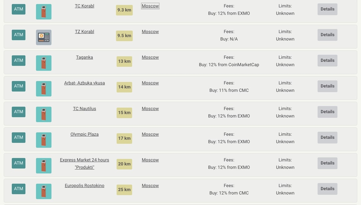 Главная страница сайта Coin ATM Radar - Появится таблица с ближайшими к вам криптоматами и условиями обмена (размерами комиссий и лимитами). Выберите криптомат, чьи условия и месторасположение вас устраивают, и отправляйтесь по указанному адресу;