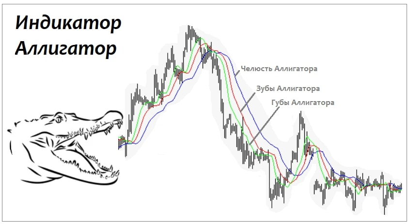 Индикатор Аллигатор (alligator indicator) — это трендовый индикатор, который визуально состоит из трех скользящих средних, расположенных на графике цен. Эти три линии называются «челюсть», «зубы» и «губы» Аллигатора, что отражает метафору, придуманную Биллом Вильямсом для описания поведения индикатора.