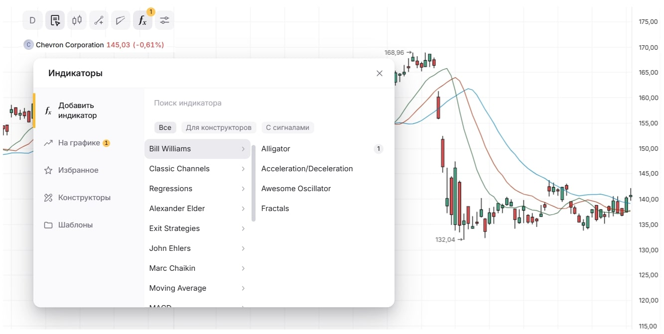 - Выберите интересующий вас финансовый актив. В этом примере — акции Chevron Corporation;