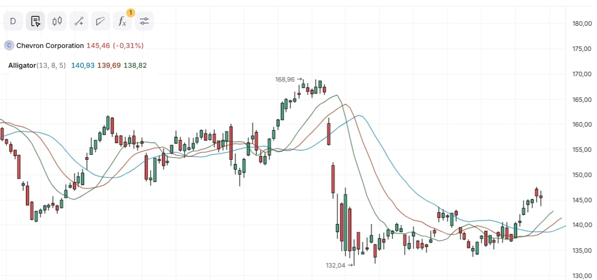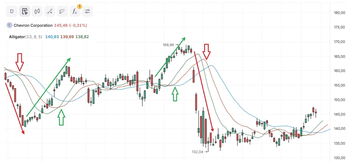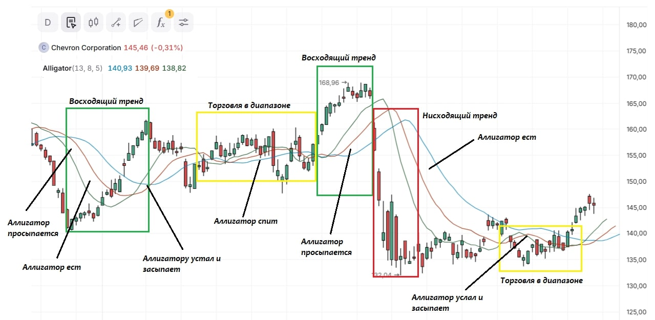 На практике это значит, что сигналы Аллигатора появляются с некоторой задержкой после начала тренда — это типично для большинства трендовых индикаторов. Поэтому его основной задачей является помощь трейдерам в определении текущего тренда и фазы консолидации рынка, а не в прогнозировании движения цены заранее. Такую ситуацию можно наблюдать на предыдущем дневном графике Chevron Corporation в выделенных областях восходящего и нисходящего тренда. В этом случае финансовый инструмент уже начал показывать динамику направленного движения, но индикатор начал давать лишь первоначальные сигналы, подтверждающие этот процесс.