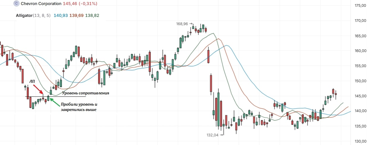 Акция компании Chevron Corporation в течение 8 торговых сессий показывает нисходящую тенденцию. Далее в акции начинается коррекция и возникает ложный пробой (ЛП) уровня сопротивления. Эта формация предполагает возобновление движения вниз, и мы видим, что после ложного пробоя следующий день действительно показывал снижение цены. Но затем финансовый актив пробивает уровень сопротивления и закрепляется выше этой точки на дневном графике. Эта ситуация указывает на то, что поведение цены явно изменилось и в акции появилась энергия для дальнейшего роста. Далее следуют одиннадцать дней восходящего тренда. При этом сигналы индикатора, действительно подтвердили это движение, но сформировались позже.