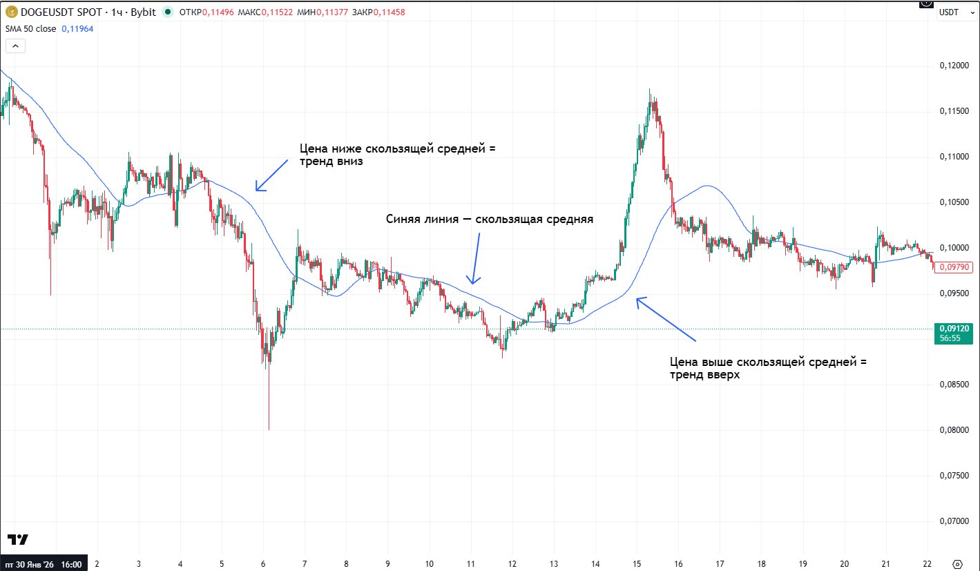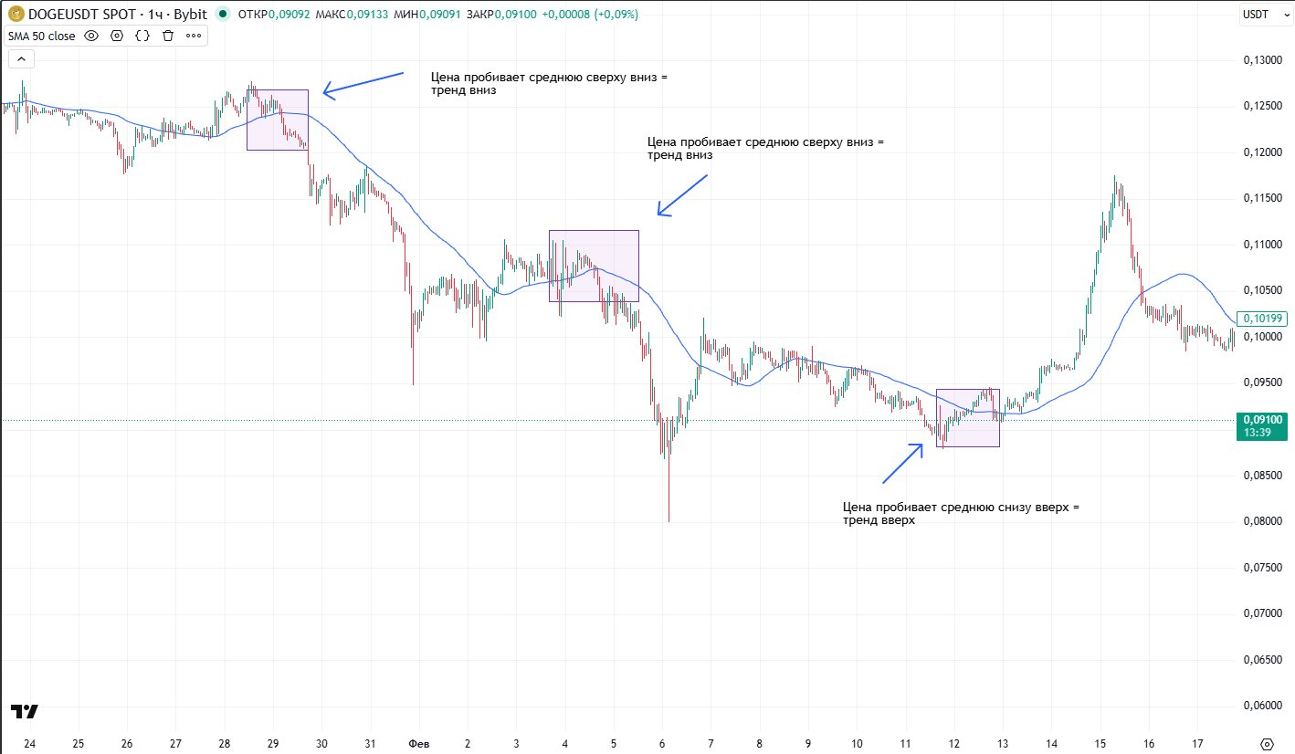 . Если цена выше скользящей средней – это сигнал восходящего тренда, если ниже – нисходящего;