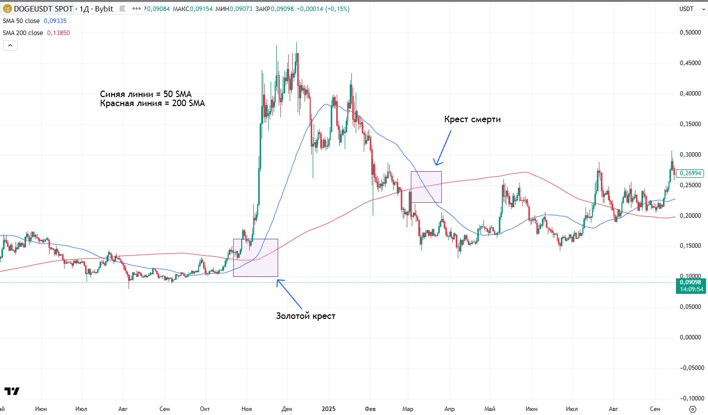 Классический пример – пересечение скользящих средних. Когда быстрая скользящая средняя (например, с периодом 50) пересекает медленную (200) снизу вверх, это называют «золотым крестом» (Golden Cross). Такой сигнал считается бычьим. Обратное пересечение сверху вниз называется «крестом смерти» (Death Cross) и является медвежьим сигналом.
