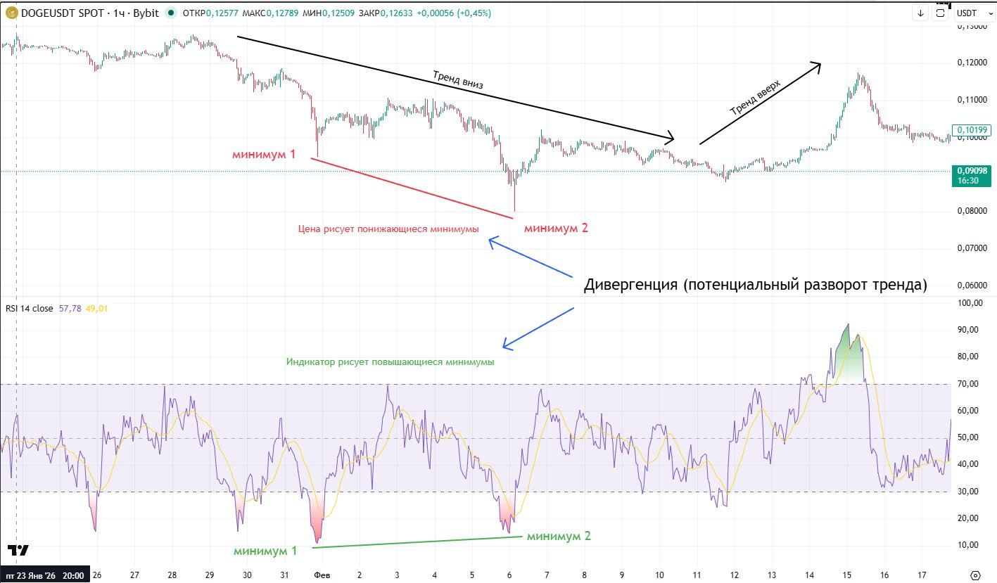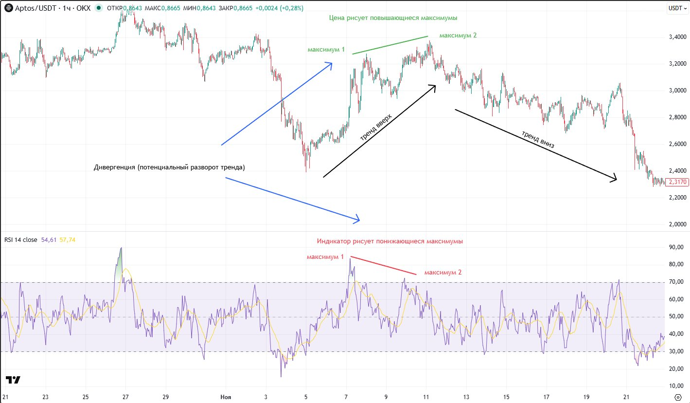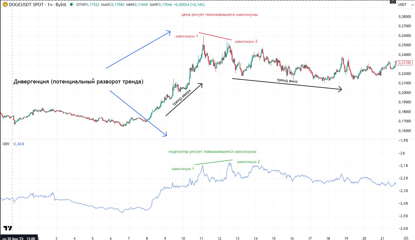 | Дивергенция | Цена идет в одну сторону, а индикатор – в другую | RSI, MACD, OBV | Текущий тренд слабеет, возможен разворот | Дивергенция может длиться долго – рынок не обязан развернуться сразу |