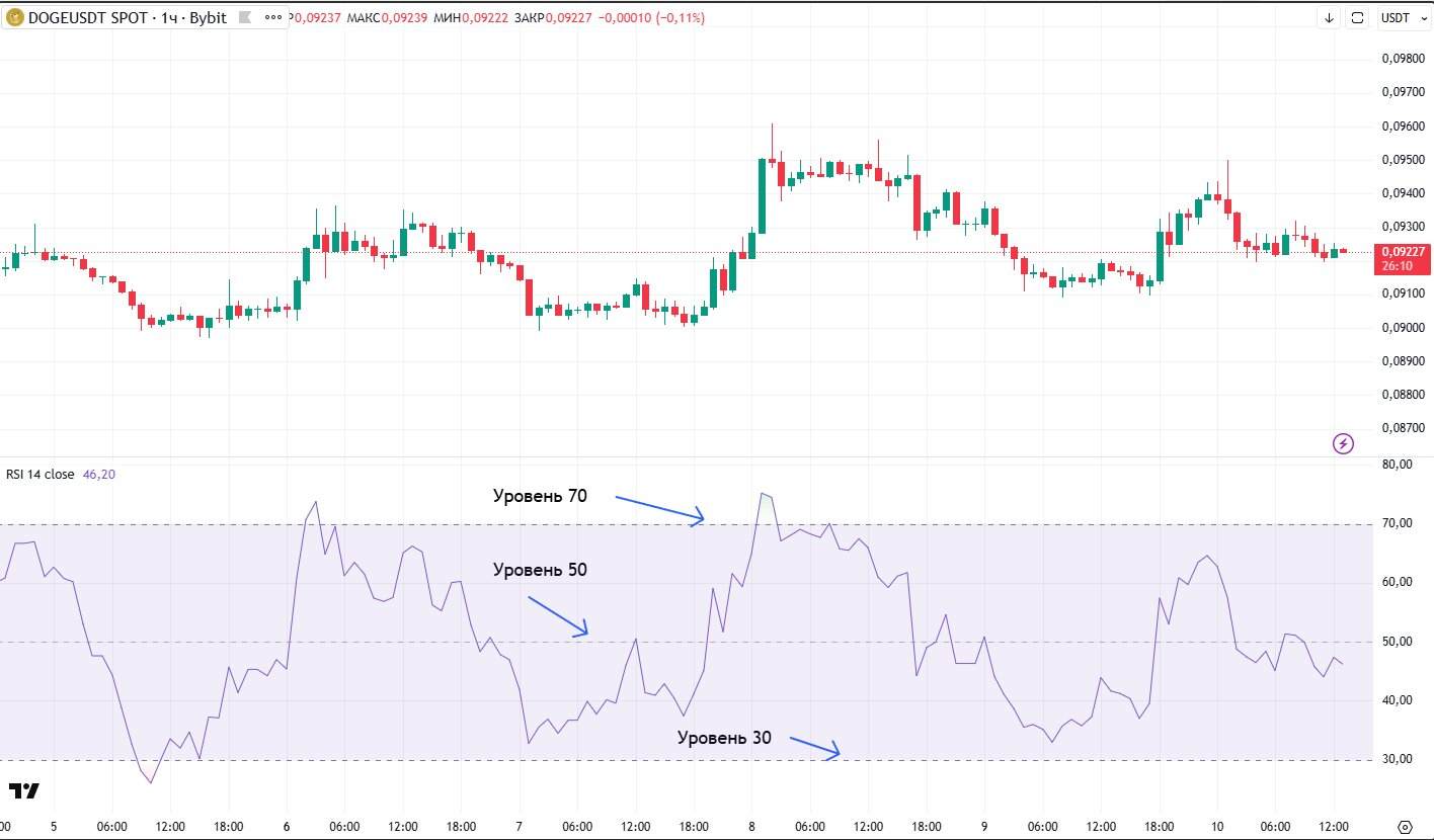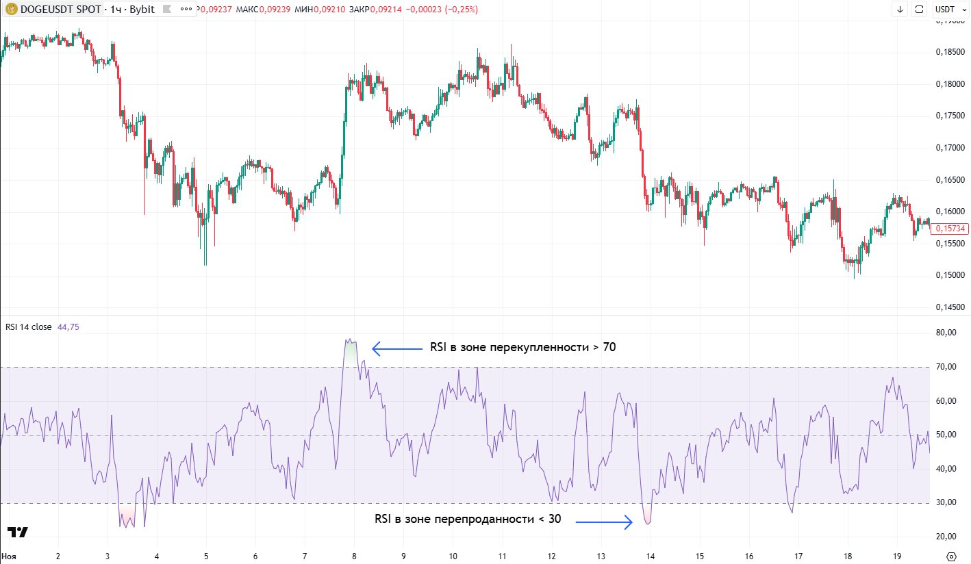 Осцилляторы (RSI, стохастик и другие) колеблются в фиксированном диапазоне и показывают, когда актив потенциально перекуплен или перепродан. Когда значение индикатора входит в экстремальную зону (например, RSI выше 70 или ниже 30), это сигнал о том, что цена выросла (или упала) слишком быстро и возможен откат назад.