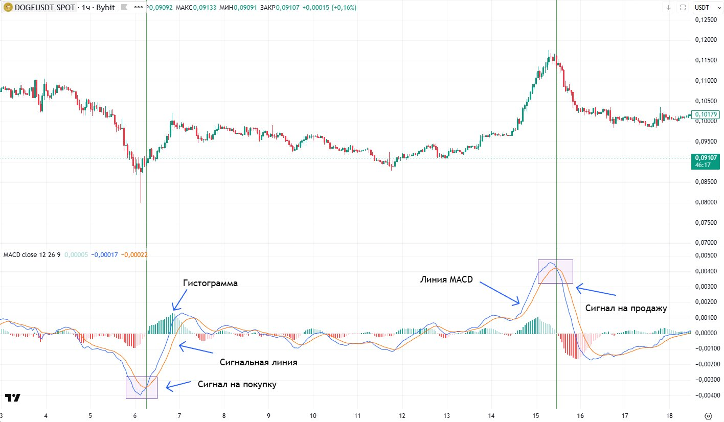 Скользящая средняя на графике DOGE/USDT - MACD (Moving Average Convergence/Divergence – схождение/расхождение скользящих средних). Строится на разнице между