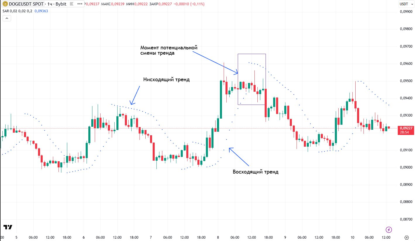 Индикатор MACD на графике DOGE/USDT - Parabolic SAR (Stop And Reverse – остановка и разворот). Строится как последовательность точек, которые следуют за ценой и постепенно приближаются к ней. Точки под ценой – тренд восходящий, над ценой – нисходящий. Момент переключения точек сигнализирует о возможном развороте.