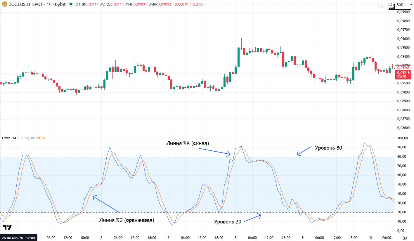 с диапазоном цен за выбранный период. Состоит из двух линий (%K и %D). Значения выше 80 указывают на перекупленность, ниже 20 – на перепроданность. Более чувствителен к краткосрочным изменениям, чем RSI.