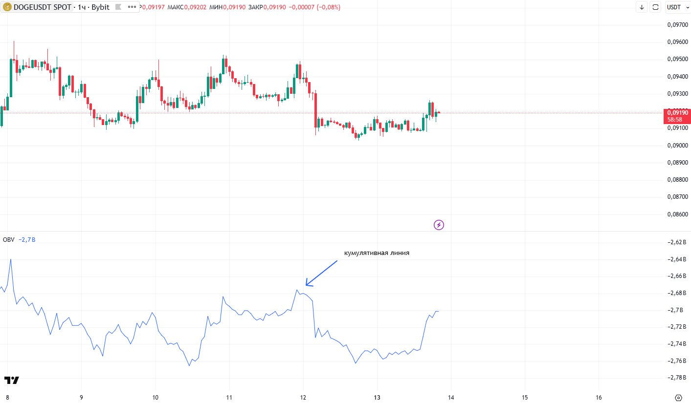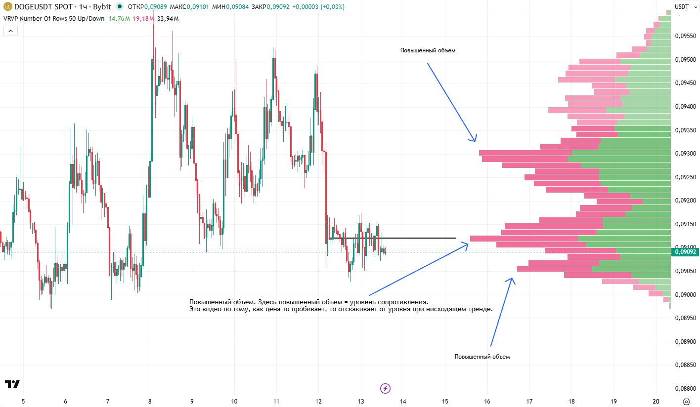 OBV на графике DOGE/USDT - Volume Profile (профиль объема). Показывает распределение торгового объема по ценовым уровням за выбранный период. Помогает определить, на каких ценах проходила основная торговая активность – эти уровни часто выступают как