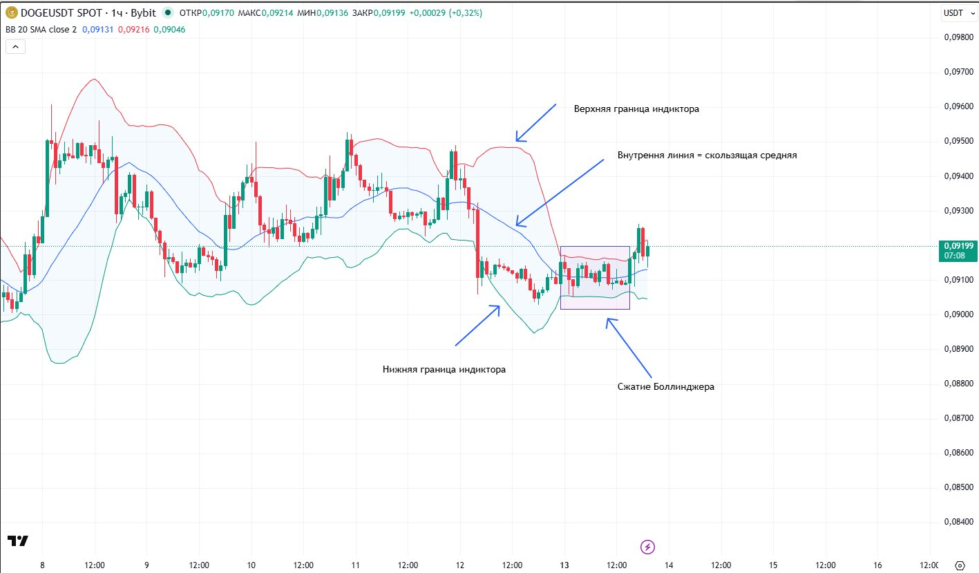 | Полосы Боллинджера | Индикатор волатильности | Ширина ценовых колебаний, моменты «сжатия» перед сильным движением | Боковик и предсказание начала тренда | Сильный тренд – цена долго держится у верхней полосы, но это не сигнал к продаже | RSI – если цена у верхней полосы и RSI выше 70, сигнал сильнее |