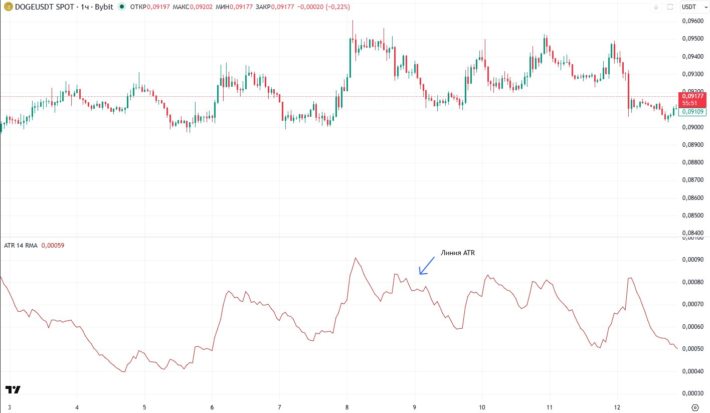Полосы Боллинджера на графике DOGE/USDT - ATR (Average True Range – средний истинный диапазон). Показывает, как сильно в среднем двигалась цена за выбранный период. Не показывает направление, только силу колебаний. Если ATR растет, рынок становится более волатильным, если падает – успокаивается. Трейдеры используют ATR для расчета стоп-лоссов: например, ставят стоп на расстоянии 1.5–2 ATR от точки входа, чтобы он не сработал от обычного рыночного шума.