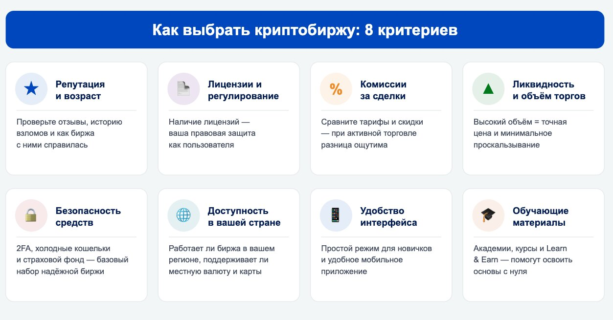 На рынке десятки криптобирж, и все они заметно отличаются друг от друга. Ниже основные критерии, на которые стоит обратить внимание при выборе площадки.