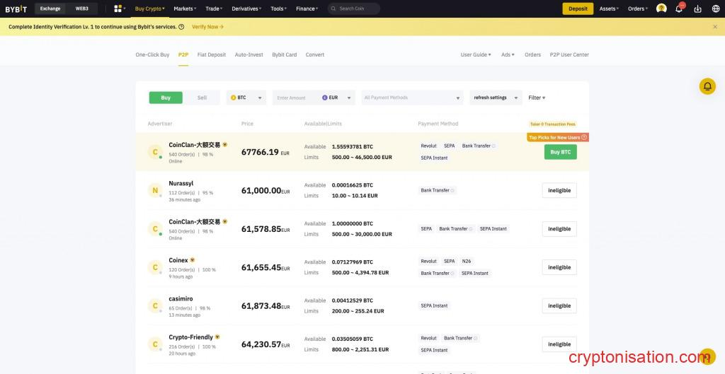 Bybit — одна из криптовалютных бирж с проверенным P2P-рынком, которая позволяет обменивать криптовалюту на 60 фиатных валют. На бирже доступно множество вариантов ввода и вывода средств через P2P, поэтому вы сможете совершить сделку на удобных для вас условиях.
