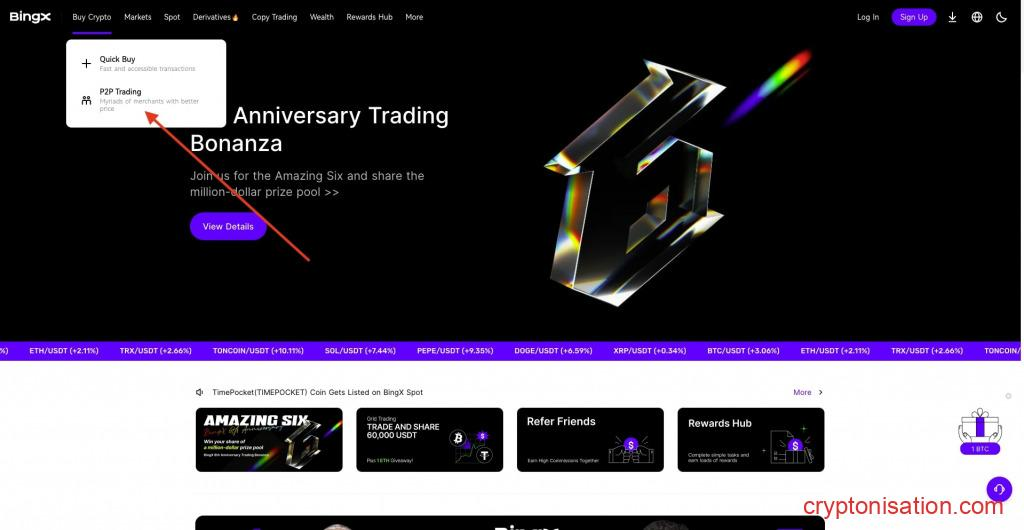 Главное окно BingX - В окне Buy Crypto выберите пункт P2P Trading;