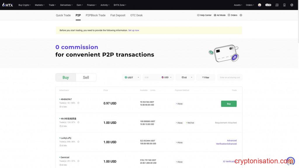 HTX (в прошлом Huobi) – биржа для торговли криптовалютой и P2P-платформа с большим выбором способов оплаты. HTX – одна из немногих P2P-бирж, которая добавила в P2P монету Tron. Всего к торговле доступно 5 криптовалют.