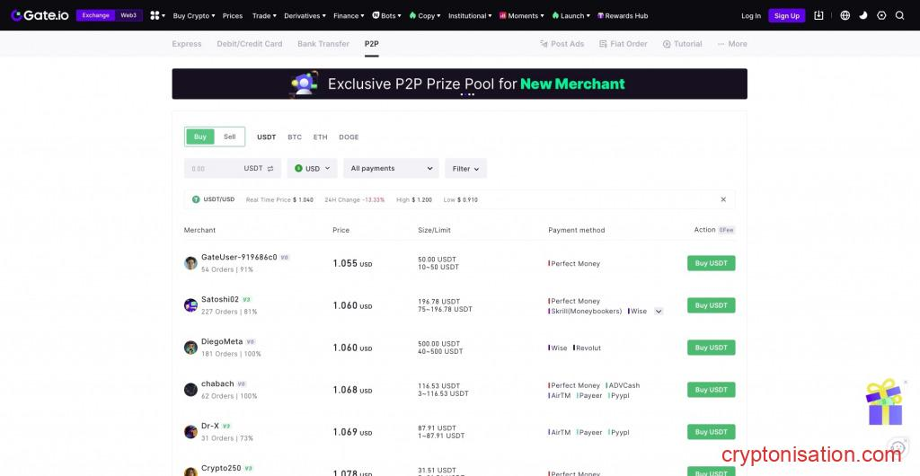 Ссылка на сайт: https://www.gate.io/c2c/market?fiat=USD