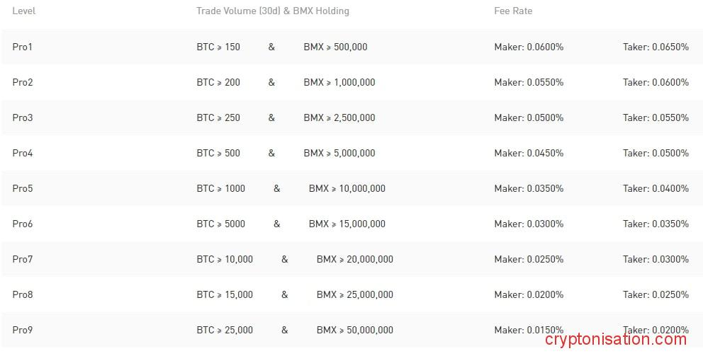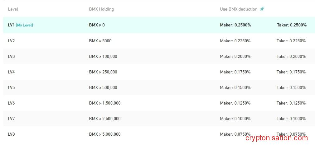 Комиссии для мейкеров и тейкеров по умолчанию начинаются от 0,25% и меняются в зависимости от ежемесячного объема торгов в BTC и BMX. Можно использовать BMX, чтобы покрыть сбор за транзакцию и получить скидку.