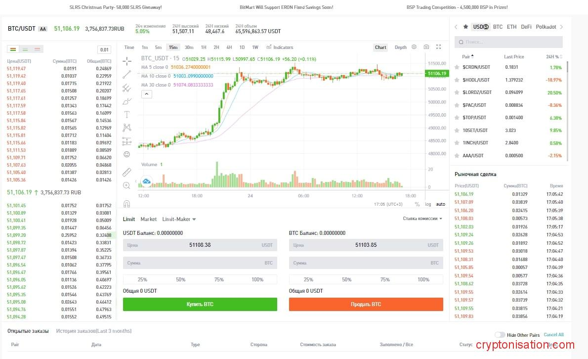 Совершение торговых операций на Битмарт не покажется сложным, так как терминал оснащен знакомым многим трейдерам графиком от TradingView и имеет необходимые инструменты для удобной торговли. 👇