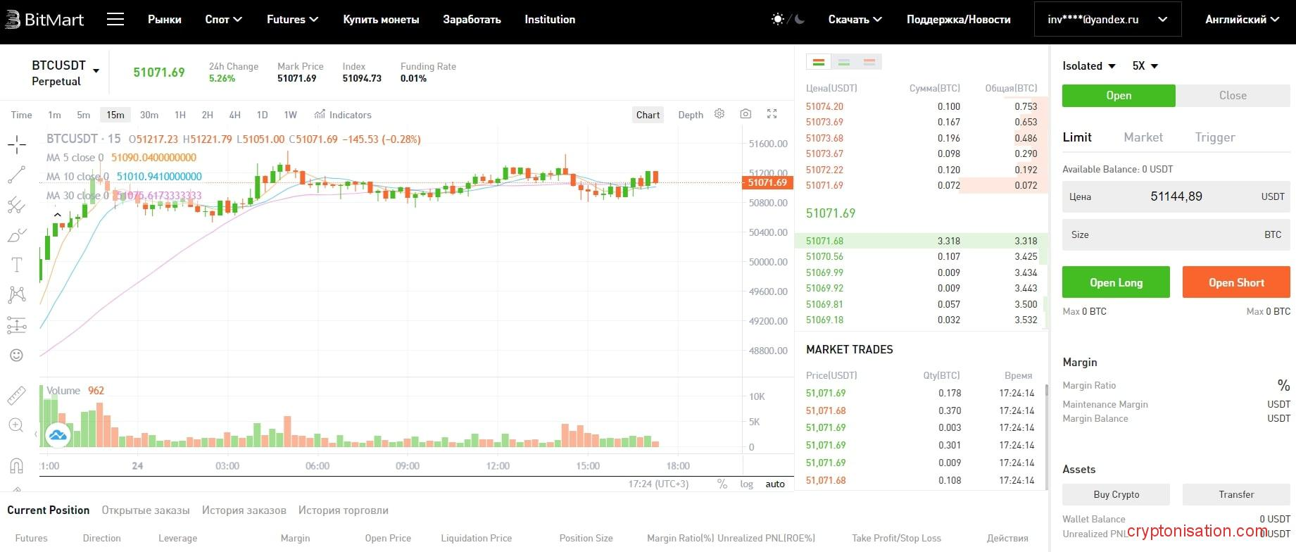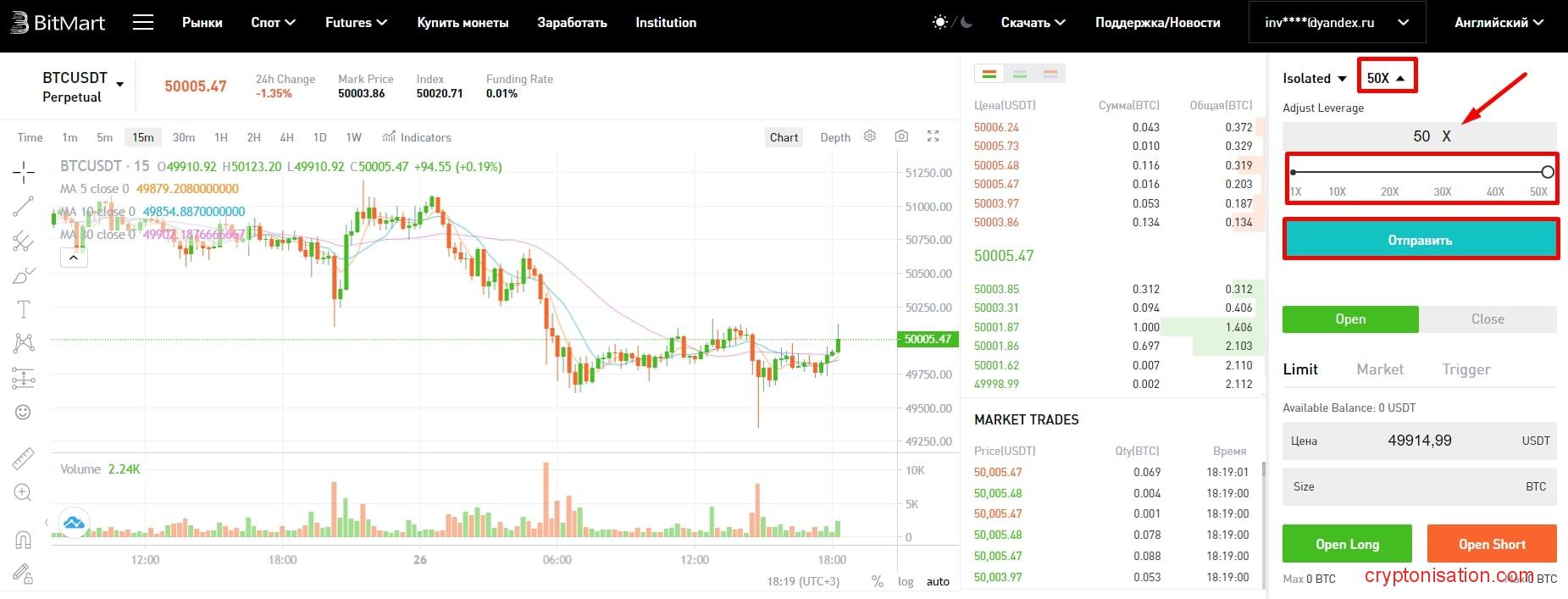 Пользователи платформы имеют доступ к рынку фьючерсов, которые позволяют трейдерам обменивать криптовалюту с маржой от х1 до х50.