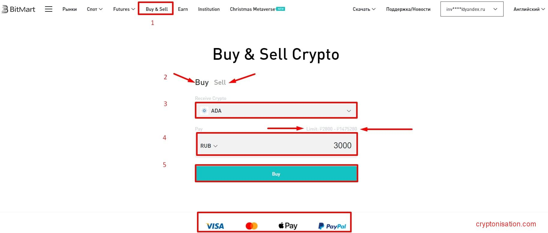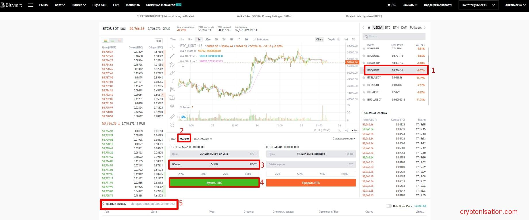 Покупку и продажу криптовалюты на Bitmart рассмотрим на примере спотового рынка и стандартного аккаунта. Для покупки потребуется: