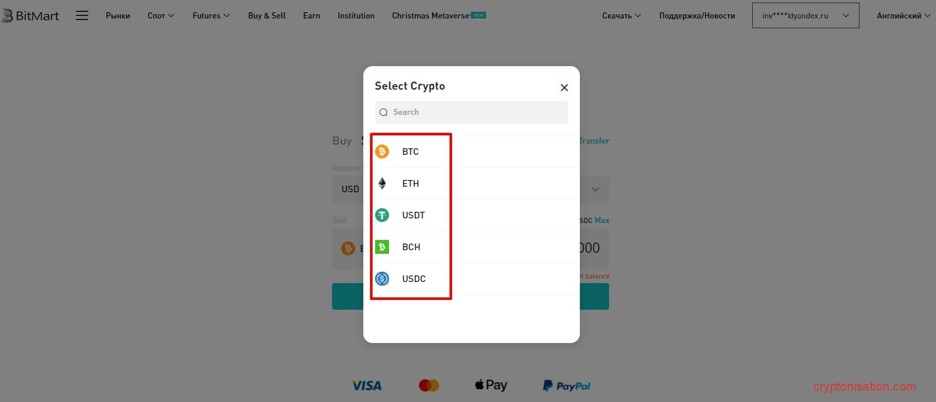 Листинг BitMart включает 981 торговых пар, многие альткоины имеют торговые пары с BMX, BTC, USDT и ETH. Кроме того, пользователи могут купить криптовалюту за фиатную валюту.