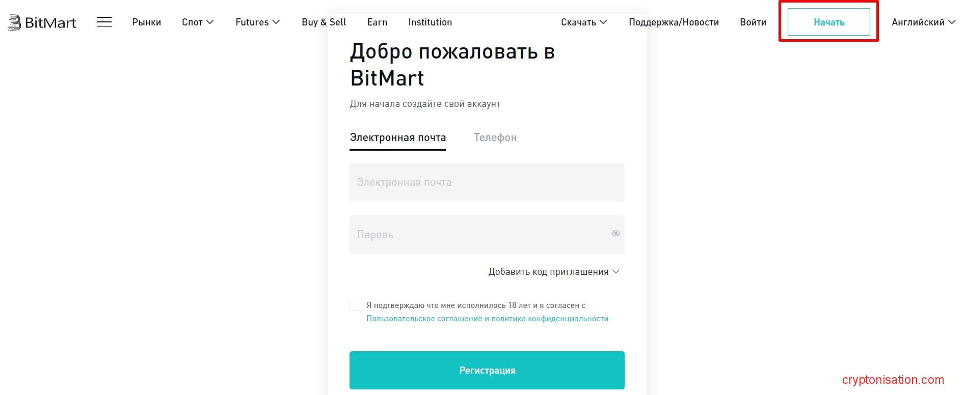 Чтобы создать учетную запись на BitMart, необходимо пройти регистрацию. Для этого нужно: