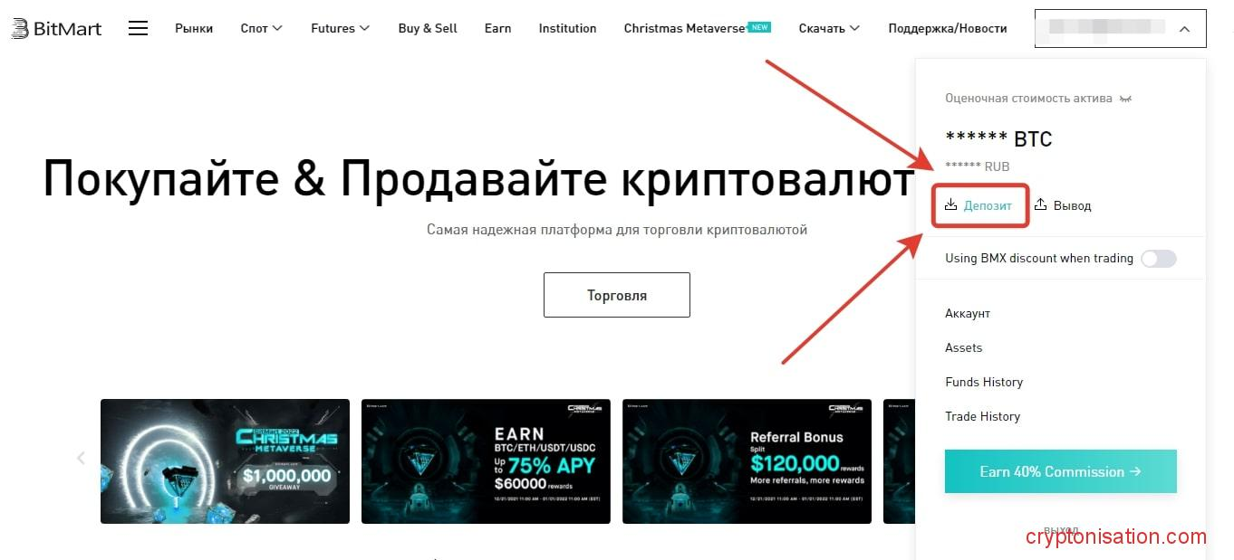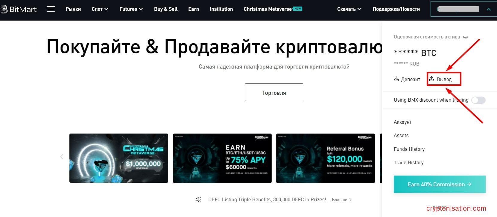 - Зайти на сайт BitMart.com, войти в аккаунт;