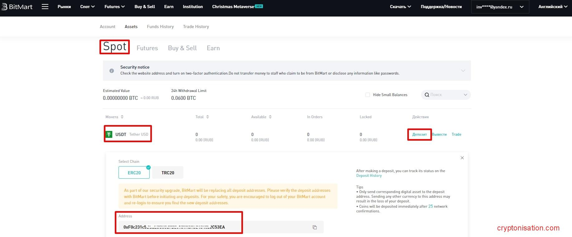 - Выбрать монету, в которой будут внесены средства, и нажать на вкладку, например, Депозит для USDT. После этого можно увидеть адрес, созданный системой. Его можно использовать для ввода USDT на счет BitMart с вашего кошелька.