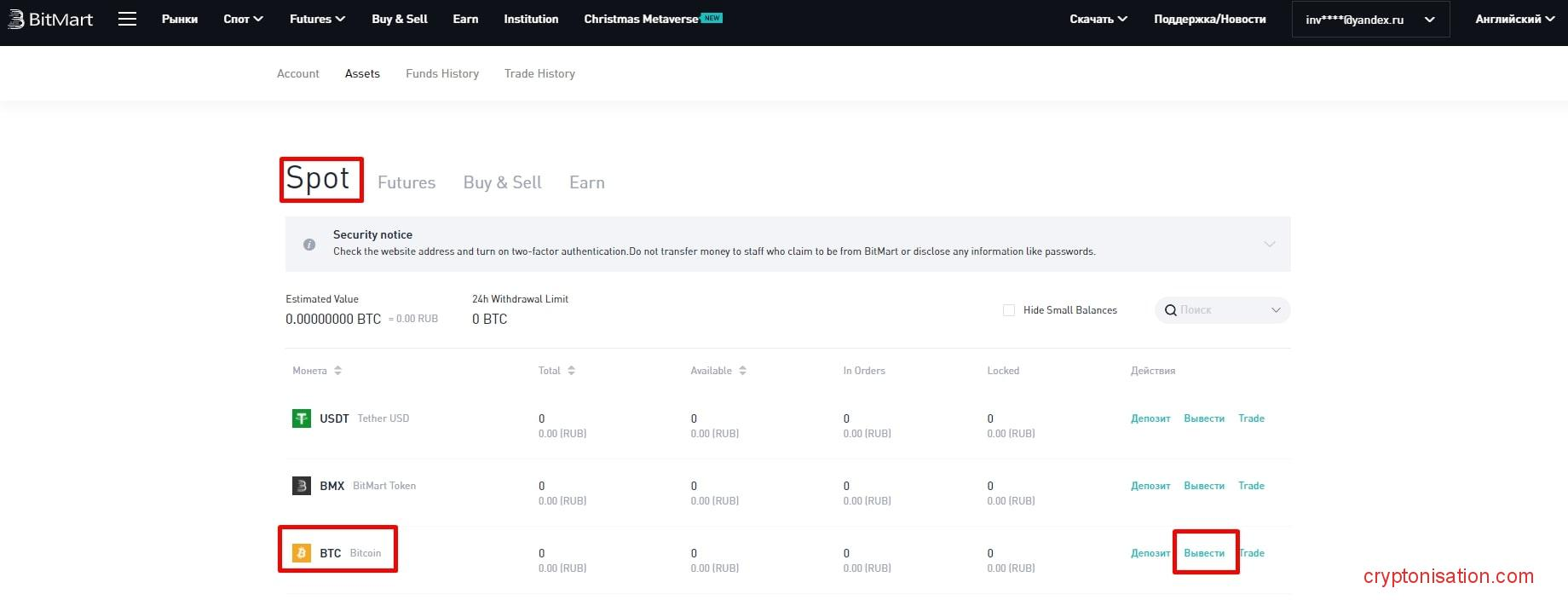 - В разделе Спот выбрать монету из списка и нажать Вывести;