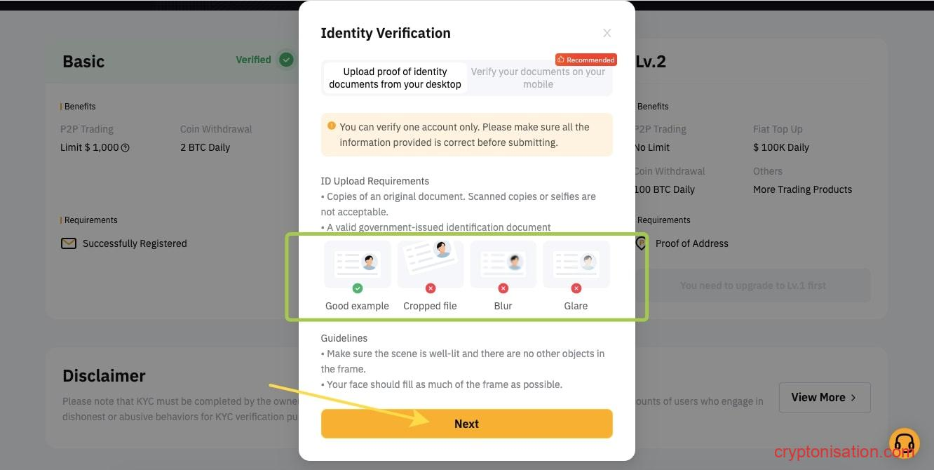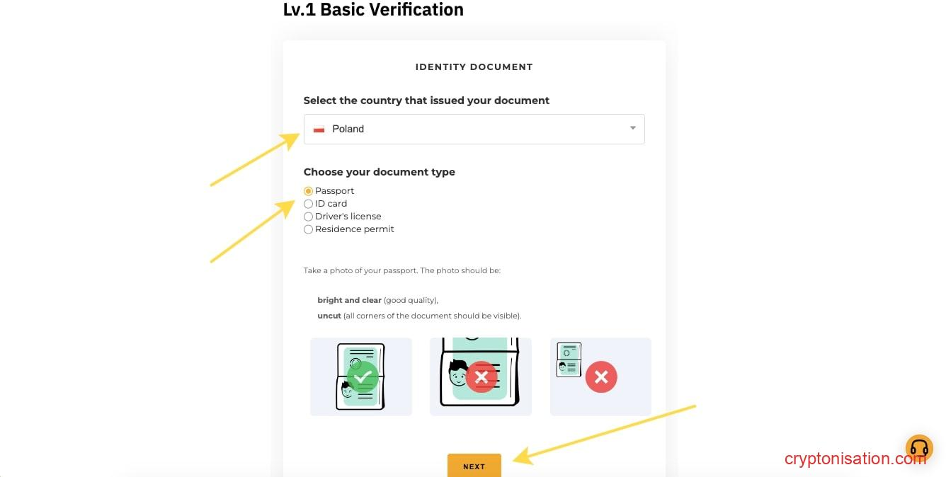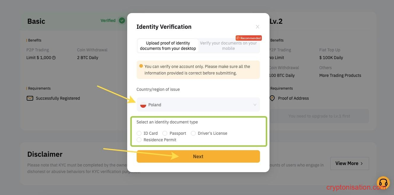 Уровни верификации - Укажите страну проживания и тип документа, который будете использовать для верификации → Next;