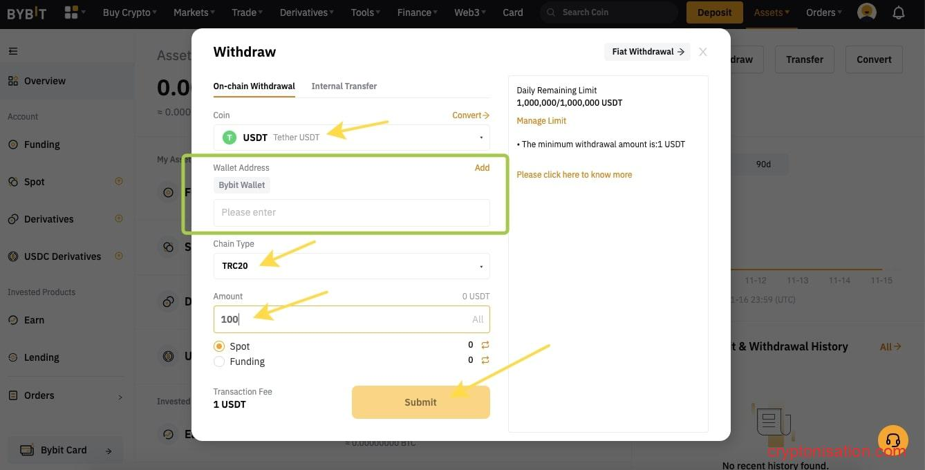 Процесс вывода USDT со спотового аккаунта биржи происходит следующим образом:
