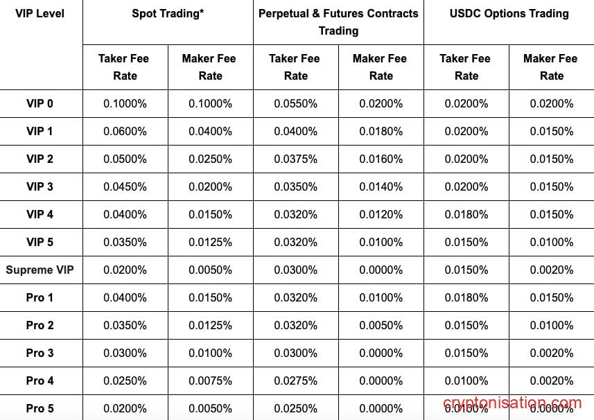 - Низкие торговые комиссии. Комиссия на спот-рынке составляет 0.1% для всех участников и снижается по мере роста торговых оборотов пользователя.
