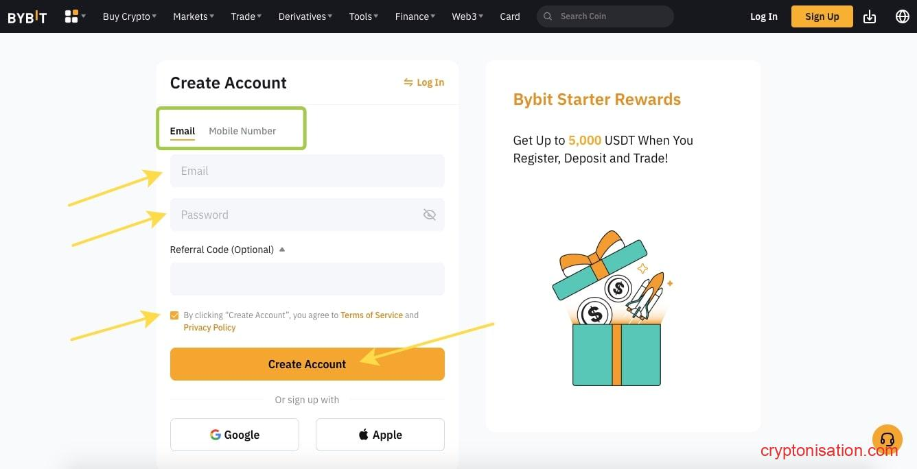 Следуйте пошаговой инструкции, чтобы создать Bybit-аккаунт: