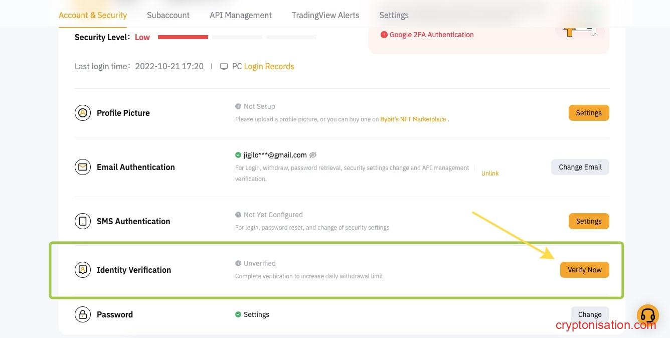Начало верификации на бирже Bybit - В списке настроек безопасности найдите строку Identity Verification → нажмите Verify now;