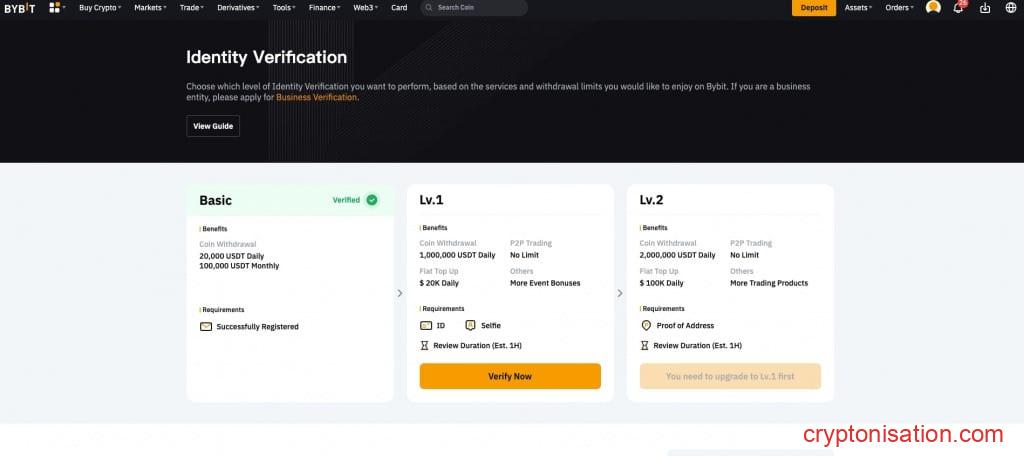 Верификация личности на Bybit - Выберите уровень верификации Lv.1 → нажмите Verify now;