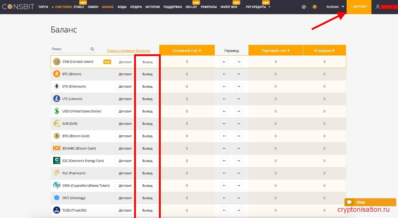Чтобы оформить заявку на вывод средств с биржи, также заходим в раздел Депозит, и в таблице напротив нужной криптовалюты выбираем Вывод.
