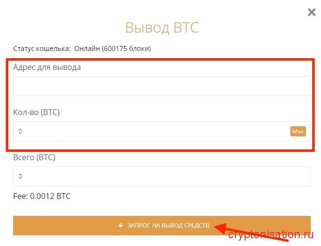 Если выводим криптовалюту, необходимо указать адрес кошелька для вывода и количество монет —> Запрос на вывод средств.
