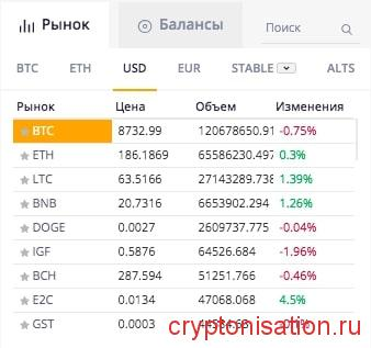 Чтобы создать ордер на покупку, переходим на страницу Торги. В графе Рынок выбираем криптовалюту, кликнув на нужную монету. Например, покупаем битки за доллары.