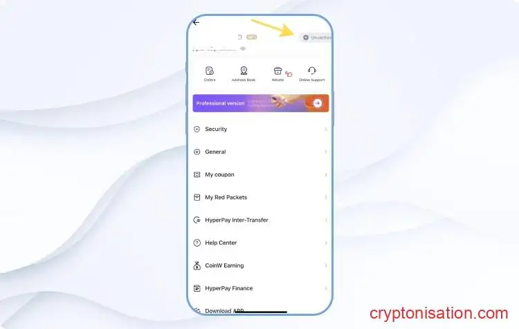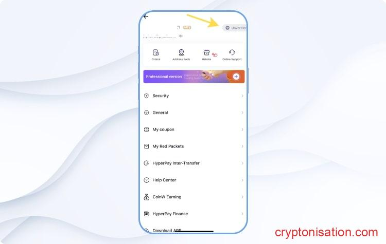 - Далее потребуется открыть мобильное приложение CoinW и выбрать Unverified возле информации пользователя;