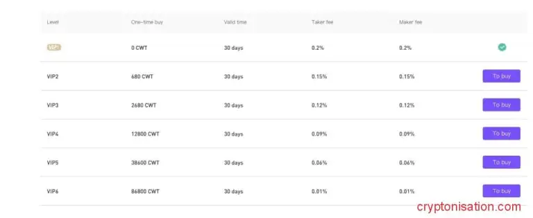 Всего на бирже 6 уровней VIP: чтобы повысить уровень, нужно купить определенное количество монет CWT (нативная валюта биржи).