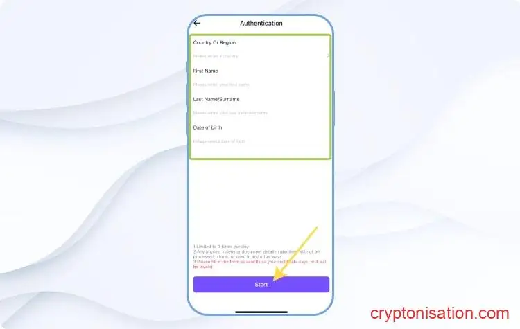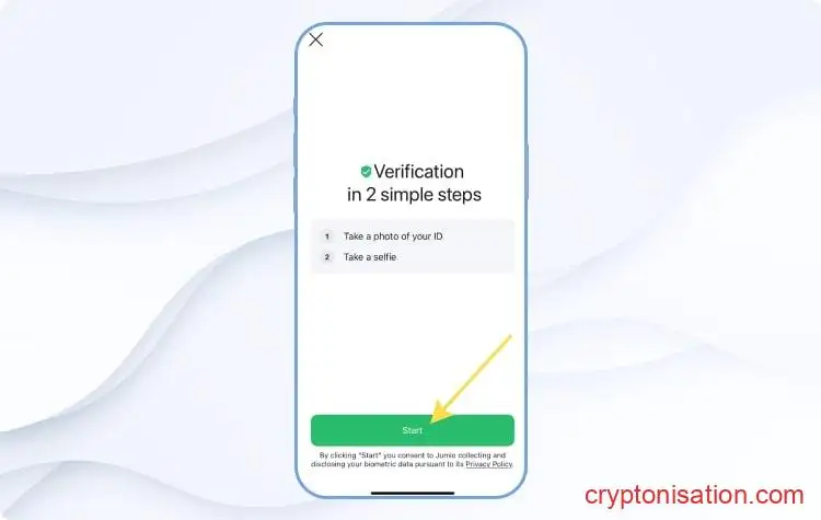 Личные данные пользователя - В следующем окне нажмите Start, чтобы сделать фото документа и селфи;